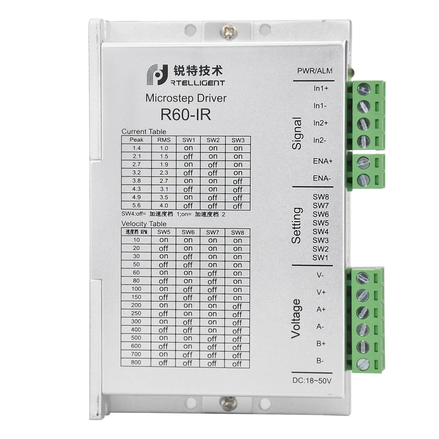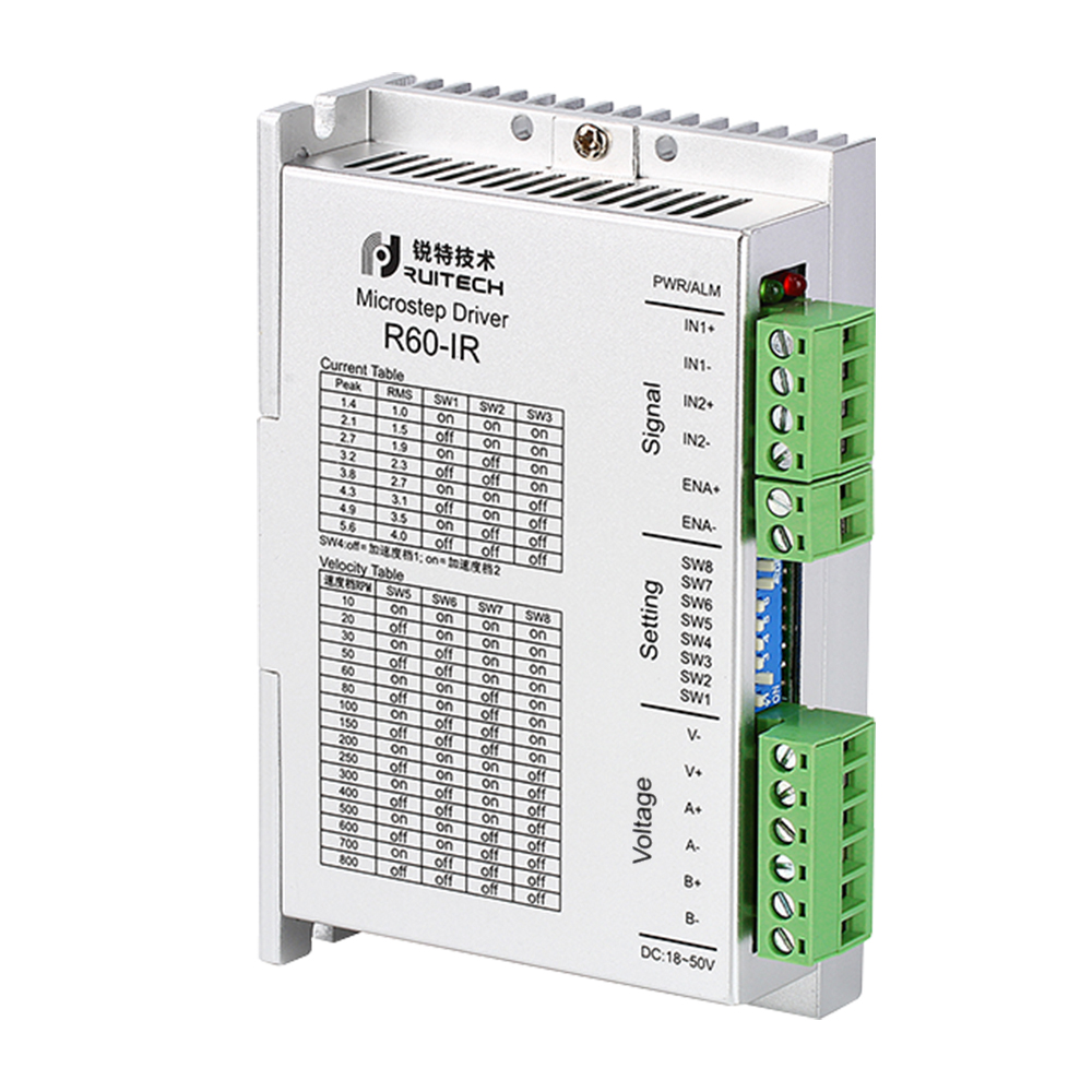 R60-IR 驱动器为锐特公司设计的开关量输入控制驱动器可电位器调速, 驱动器内部集成了运动控制模块,支持 IO 触发定速运动。