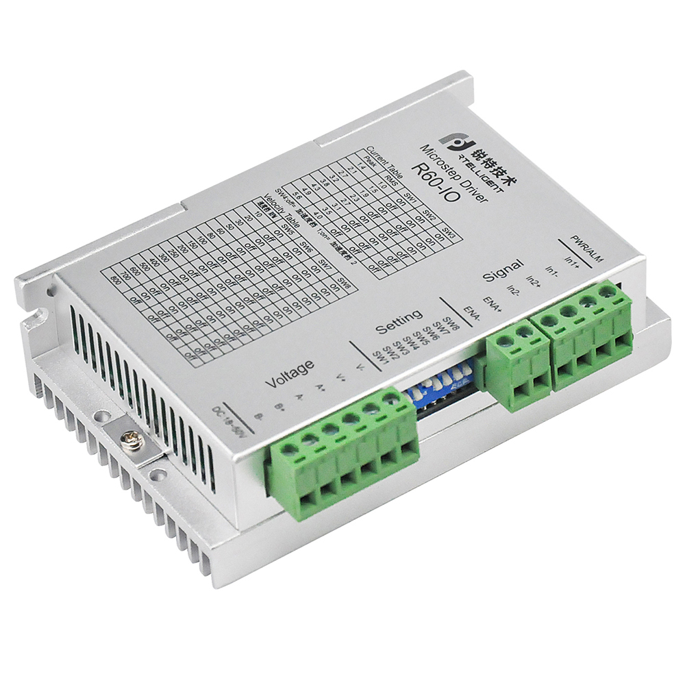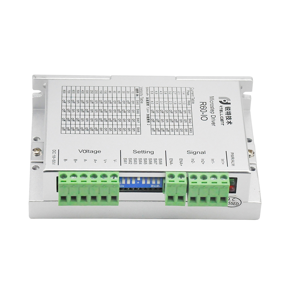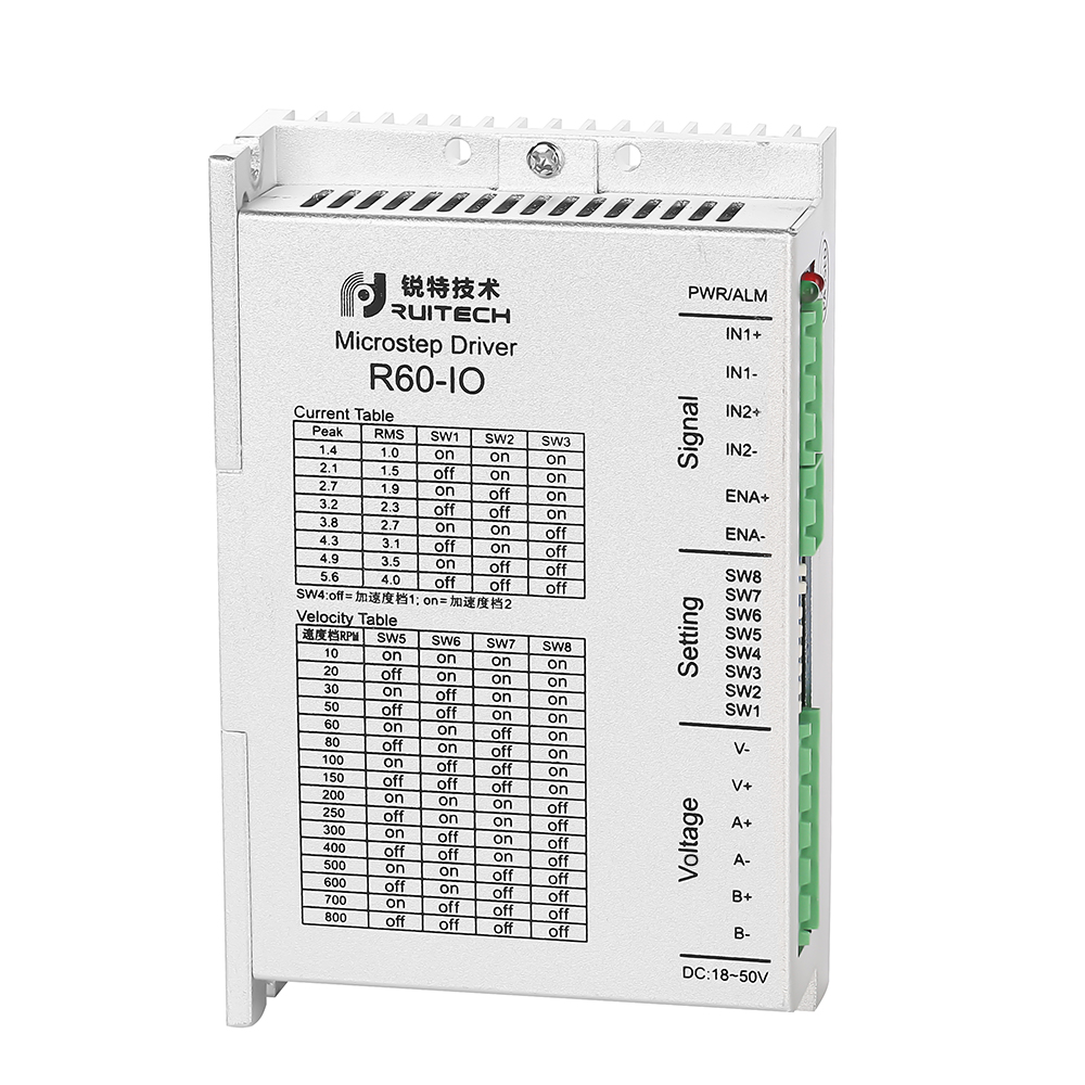 R60-IRD 驱动器为锐特公司设计的开关量输入电位器调速控制功能型驱动器, 驱动器内部集成了运动控制模块,支持 IO 触发定速运动电位器动态调节电机转速。 可通过拨码开关选择运行电流和速度,有 8 档转速、8 种电流选择,具有过压,欠压,过电流保护,其输入输出控制信号均采用光电隔离。